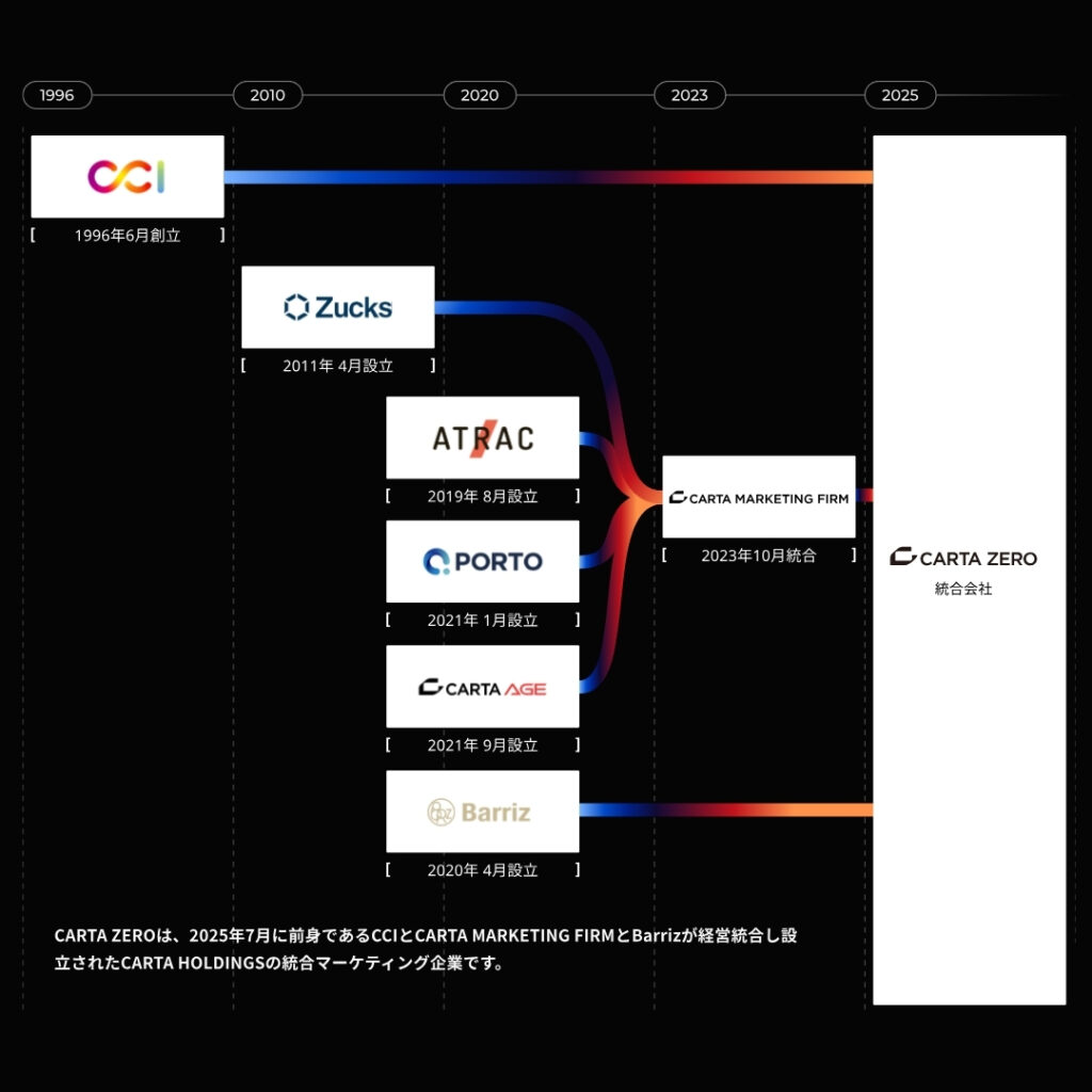 CARTA ZEROは、2025年7月に前身であるCCIとCARTA MARKETING FIRMとBarrizが経営統合し設立されたCARTA HOLDINGSの統合マーケティング企業です。